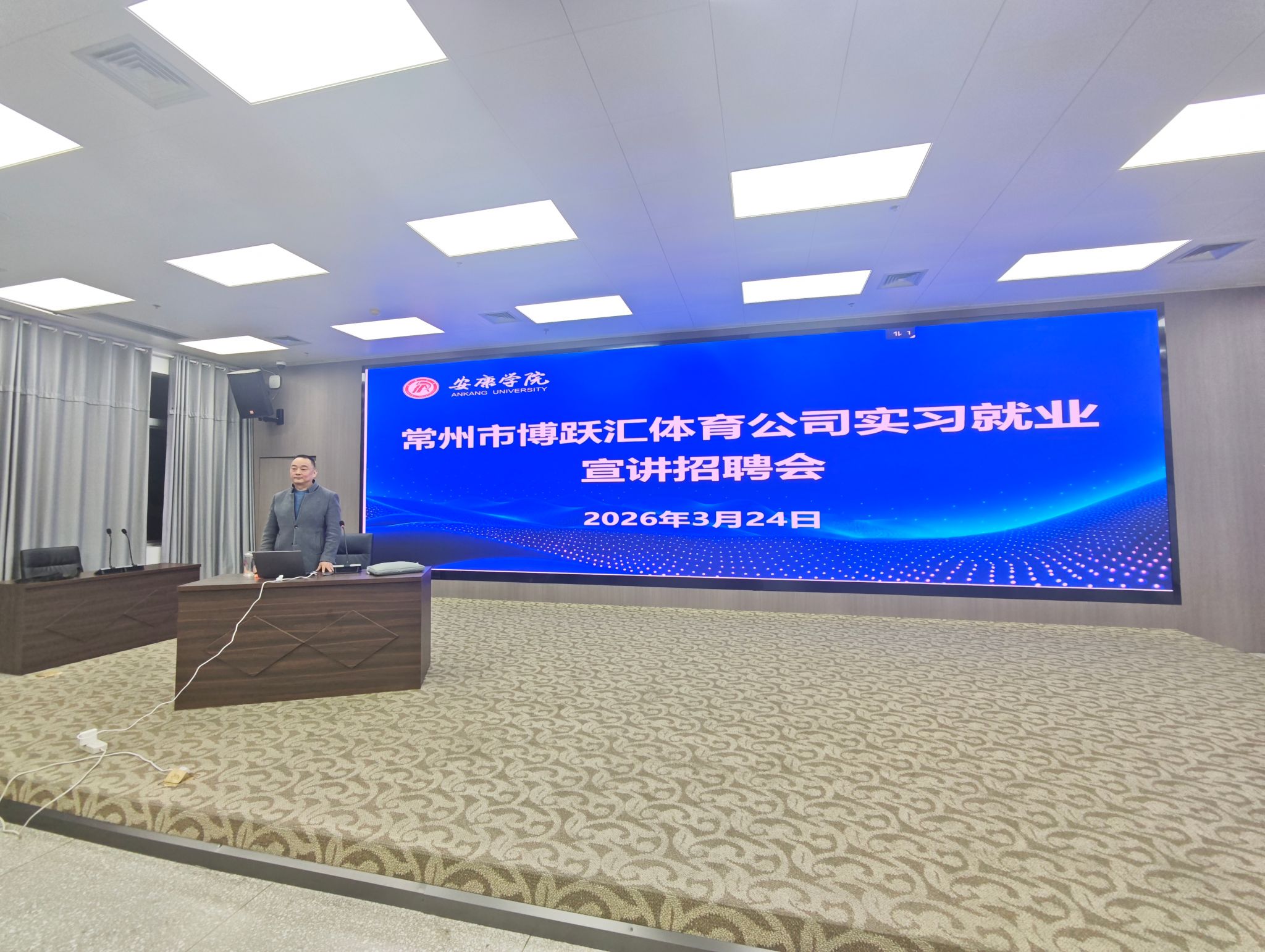 3月24日晚,常州博跃汇体育文化产业发展有限公司董事长巢旭、相关负责人黄明君一行莅临我院,面向大三、大四年级学生举办实习就业专场宣讲会。威廉希尔体育领导班子成员、全体辅导员和全体大三、大四同学共同参加了此次活动。